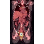 A coronal fused image of 2-18F-deoxyglucose-based positron emission tomography (PET) and computed tomography (CT, obtained with x-rays) of a patient with squamous cell carcinoma of the cervix