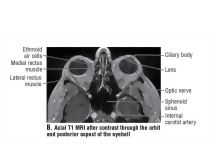 Axial T1 MRI After Contrast Through the Orbit and Posterior Aspect of the Eyeball